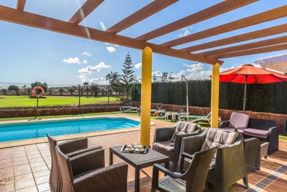 Villa Sammia is a wonderful four-bedroom villa situated right on the frontline of the golf course at Caleta de Fuste and only 15 minutes walk to the beach. This modern retreat is designed for luxury and relaxation, featuring air conditioning throughout, satellite television channels, and complimentary fibre connected Wi-Fi internet access. With its prime south-facing orientation, Villa Sammia enjoys an abundance of sunlight, making it the perfect spot for relaxation and leisure. Guests can bask in the warm rays while taking in stunning views of the lush greens, creating an idyllic setting for a memorable holiday experience.